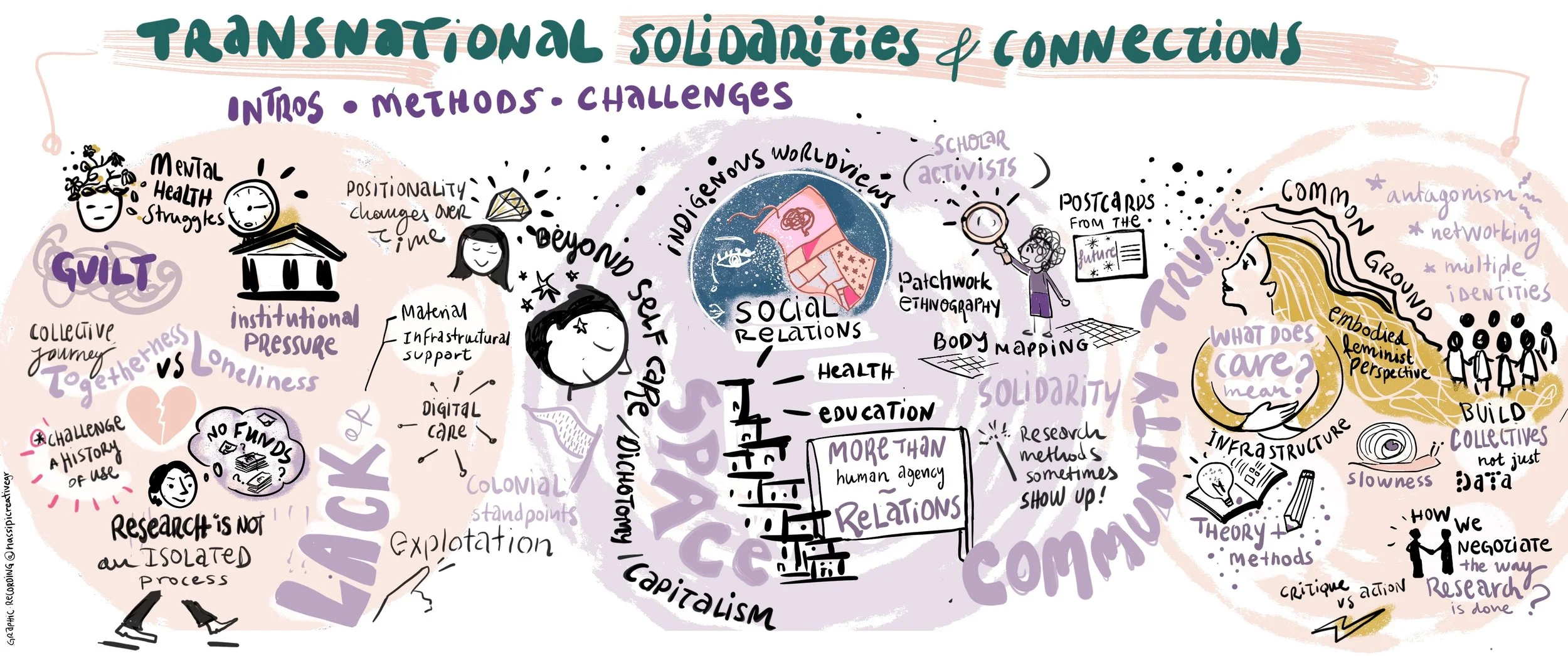 The visual minutes of the workshop “Transnational Solidarities and Connections: Towards Ethical Community-Actor Collaborations – A Feminist Southeastern European Perspective” were created by Athanasia Panagiotidi. Through attentive listening and careful rendering, she traced the collective thinking in the room, translating layered conversations into image. Seeing our dialogue take visual form feels like another kind of care work — a way of holding what was shared.